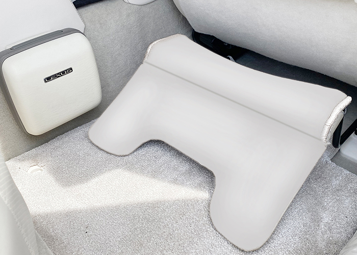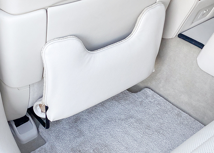LS600hL エグゼクティブには左後席に電動オットマンが装着されていますが、使用性や快適性が本当に良いのかと自身では疑問に思っていて、むしろ30系セルシオでオプション設定のあったオットマンの方が、使用性及び快適性が良いのではと考えておりました。加えて快適装備が左後ろのみというのもあまり好きではなく、右後席にお乗りになられる方にも快適に車内で過ごしていただけるように、自分なりの後席快適を求め30セルシオ用のオットマンの表皮を専門業者さんに張り替えていただき、車両取り付けに必要な自作ブラケットを作成し、後席快適装備の充実をおこないました。