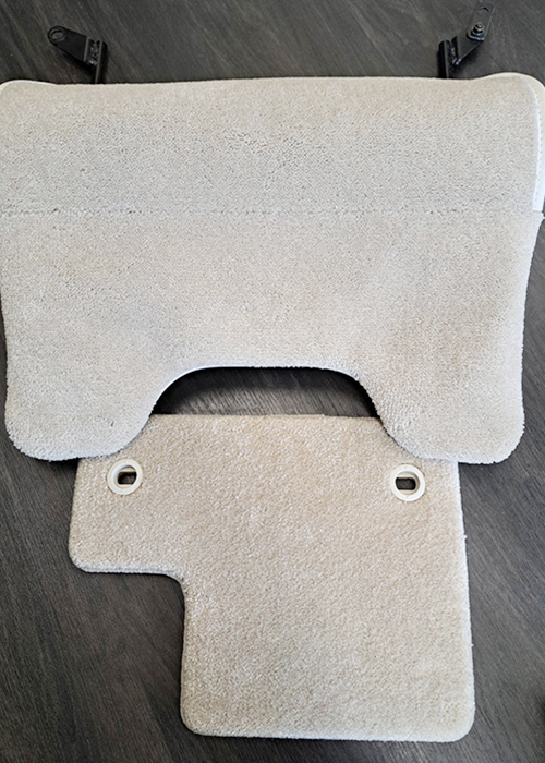 その1、その2が駄目な場合のさらなる副案、純正の色味に近いが少しだけ濃い色味で、さりげない装着アピールと汚れが目立ちにくくする。表面は擬似レザーを用いて、裏面はカーペットを用いて少し濃い色味でのカラーコーティネートを行う。