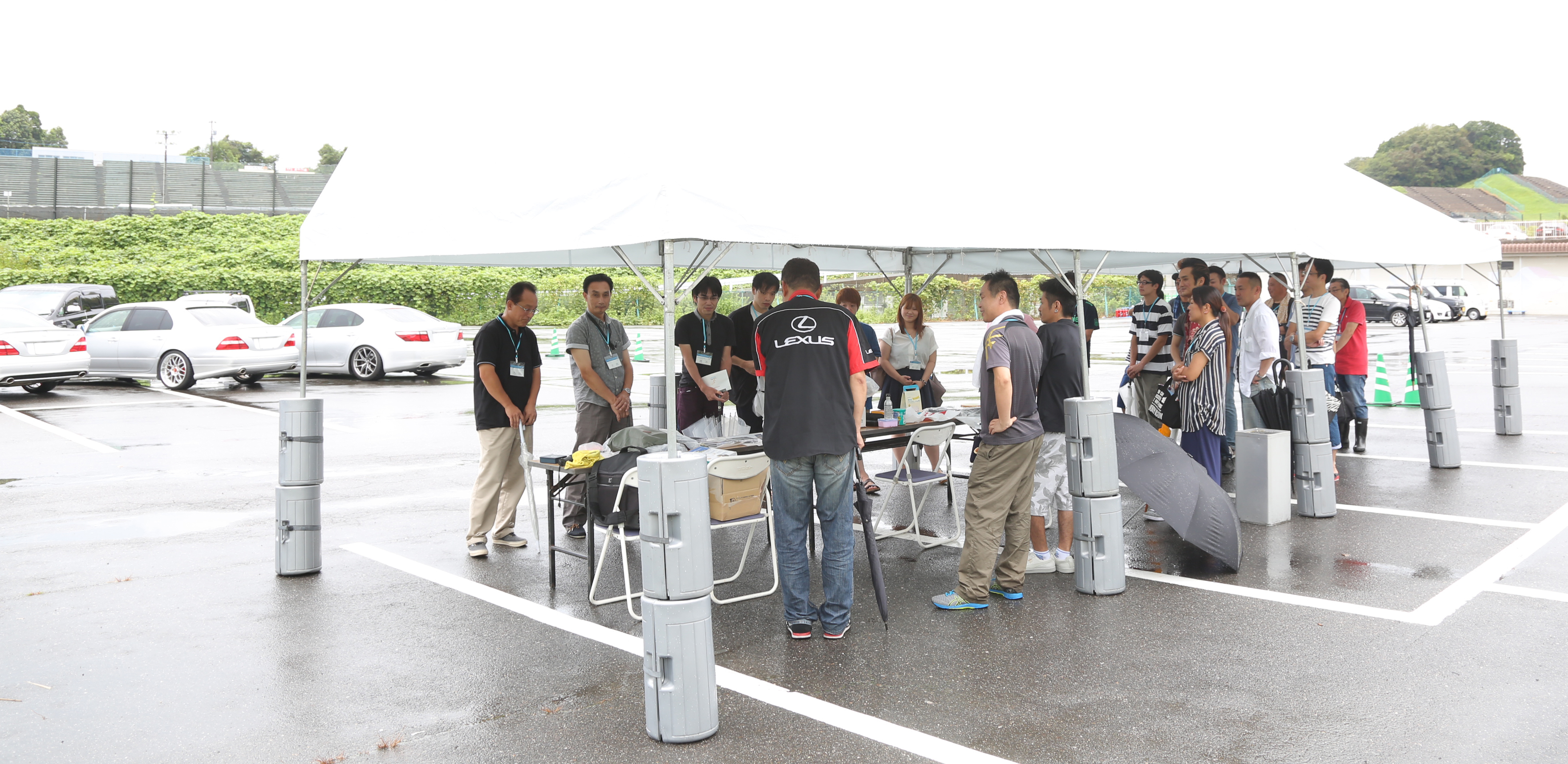 雨交じりの天候に悩まされましたが、体験走行前に少しづつ天候も回復、オフ会の愛車拝見タイムを終えサーキット係員の方による走行上の注意を受け、体験走行に備え隊列を組んで出発待ちの風景。