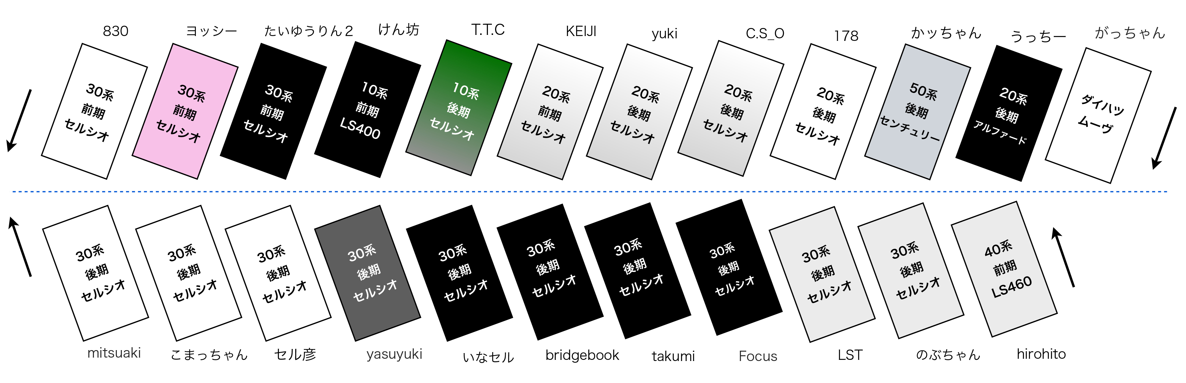 過去のオフ会では実現しなかった10系前期から30系後期まで全シリーズが揃いました。