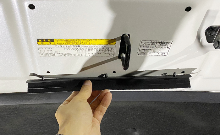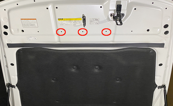ボンネット裏面センター付近にある差し込み穴3つ(画像の赤丸部分)に、ラバーにセットされているピンを入れて固定するだけの簡単装着。