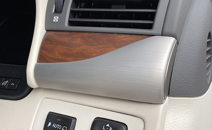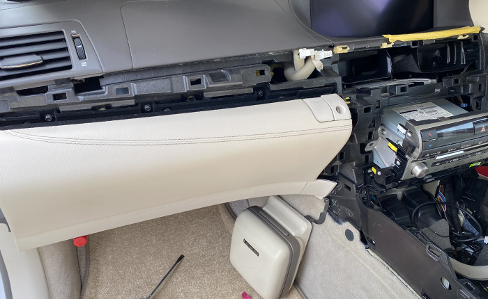グローブボックス上部のウッドパネル下部に収納されているので、ウッドパネルの取り外し。