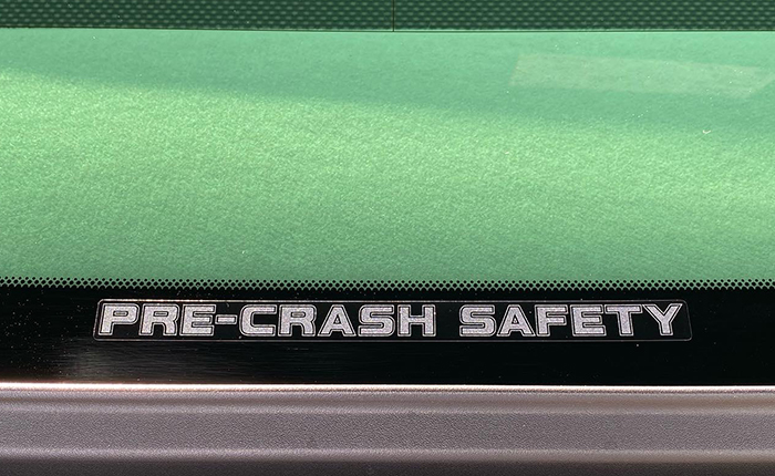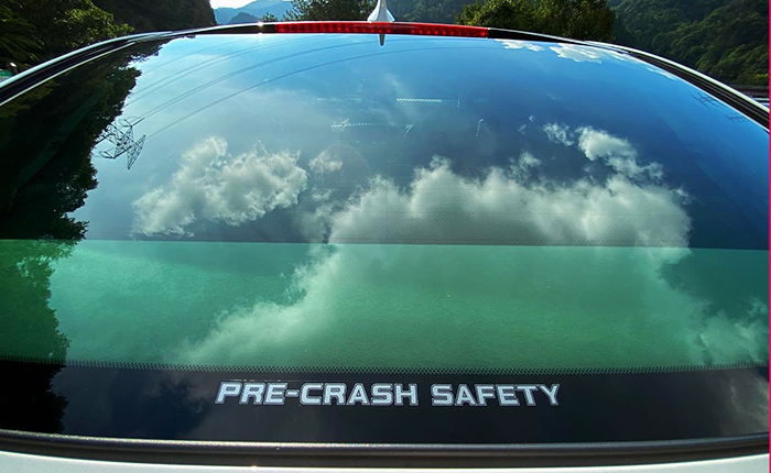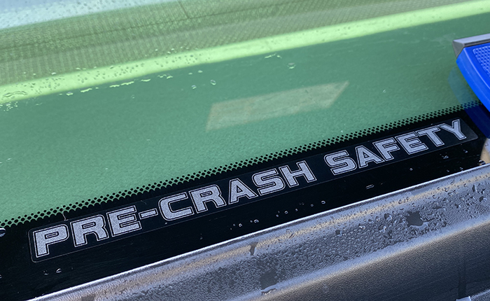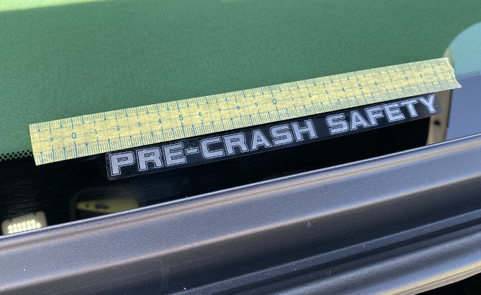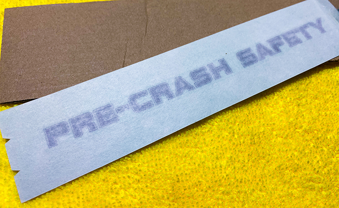 30系セルシオまではリヤトレーボードにハイマウントストップランプが装着されていて、見た目のアクセントがあって私は好みでしたが、40系LSはハイマウントストップランプがバックウインドウ上部に移動して、ウインドウ下部センターがちょっと寂しい雰囲気に思えます。購入時よりここにワンポイント欲しいと思っており、北米仕様のオプション設定の『LEXUS HYBRID DRIVE』ステッカーを貼り付けようかと考えましたが、それだと芸がないと思い少し趣を変え、カローラ アクシオの一部グレードに設定があった『PRE-CRASH SAFETY』デカールをは貼り付けることにしました。
