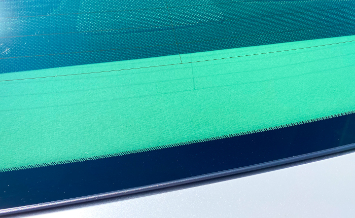 ①バックウインドウのクリーニングと脱脂を行い、位置ぎめのマスキングテープの貼り付け。