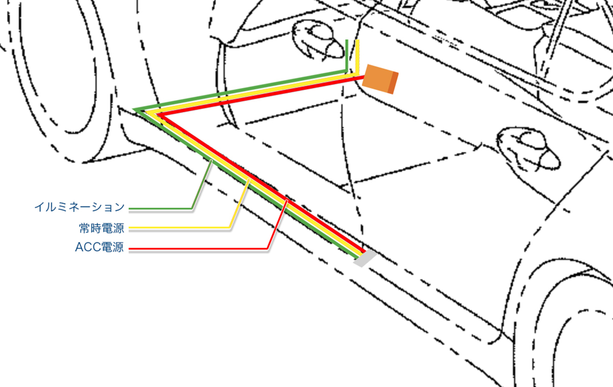ACC電源の他に常時電源、イルミネーション(プラス/マイナス)と予備線を追加しています。