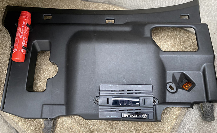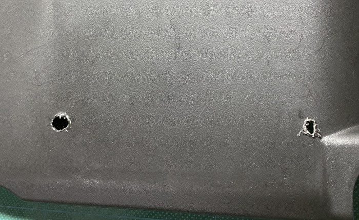 助手席アンダーカバー下側に貼り付けられていた本体、ご覧のような穴を開けた所に