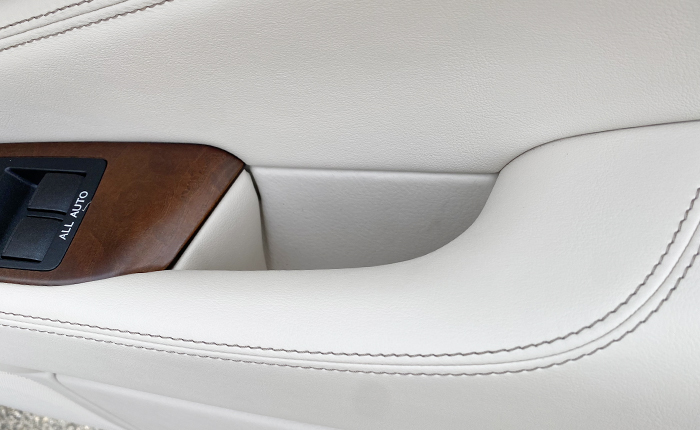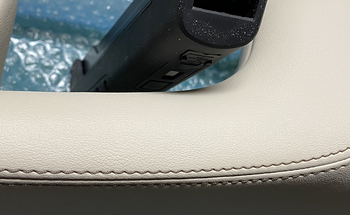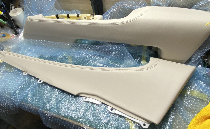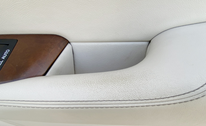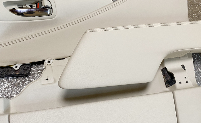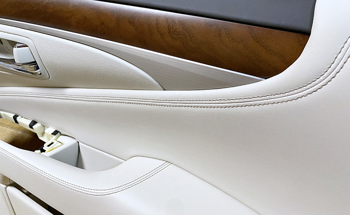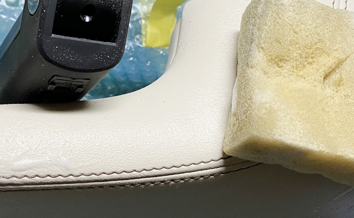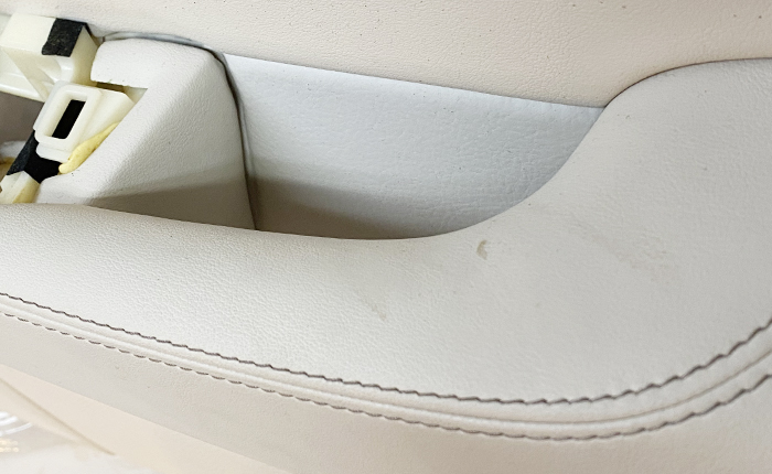 革内装部品で痛み(劣化)早く進む部分の一つである、運転席アームレスト&ドアトリム、普段から気をつけていてもメローホワイト内装は知らない間に皮脂やその他の汚れに犯されていきます。