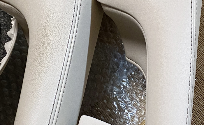 ふたつのアームレスト、実は素材が異なり、左の痛んでいる私の車両についていたアームレストは本革、交換するアームレストは合成皮革、見た目はよく似ていますが素材は異なり、今回の交換目的はここにあり、高級素材の本革は耐久性が若干劣るので、合成皮革に変更し、少しでも耐久性をよくする目的があります。