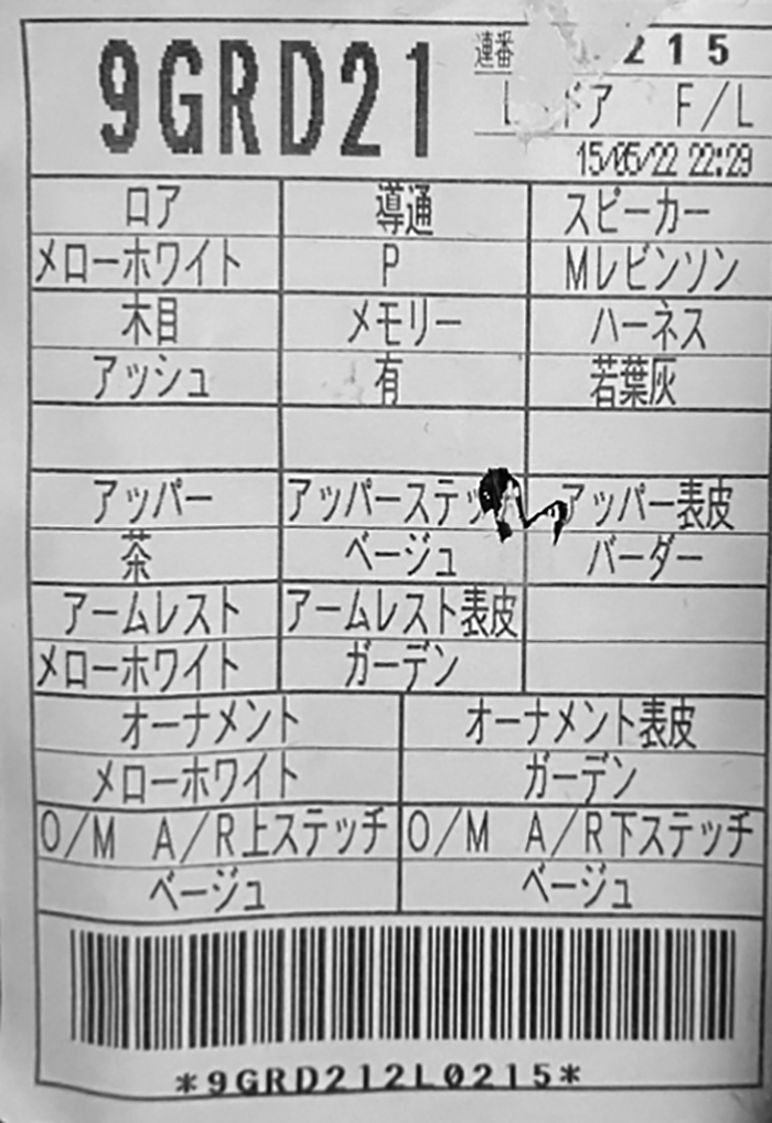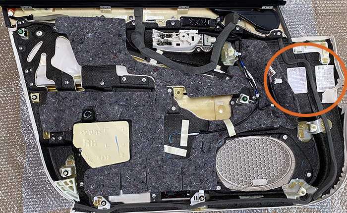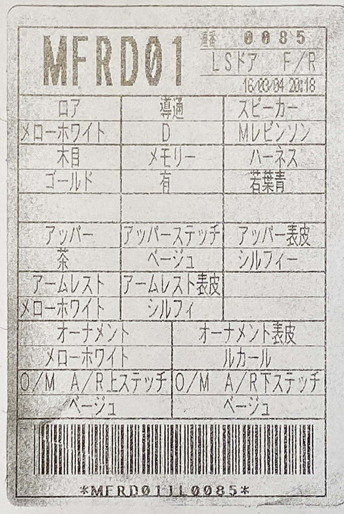 ドアトリム裏面の部品素材が表記されたシール、マニアにとってはこれを見て読み解くのが楽しい時間。
