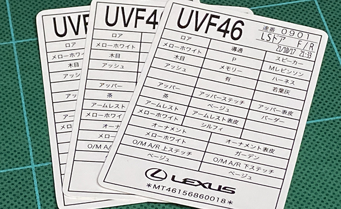 いきなり話しが脱線してしまいましたが、今回のリフレッシュは素材置換を行うので部品素材シールを作成し、ドアトリム裏面に貼り付けることに、画像は試作品でこの校正、後最終仕上げを行いました。
