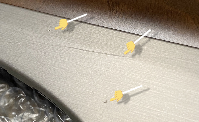 前オーナーが傷つけたと思われるアルミ部分の線傷と凹み。
