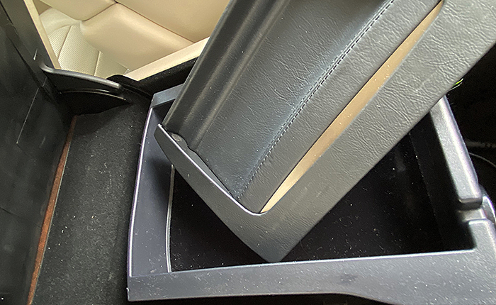 センターアームレストに設定されている、高価なオプションのコンソールトレー。