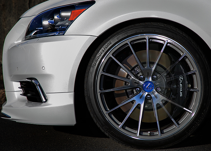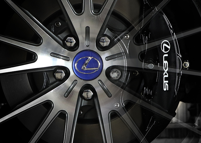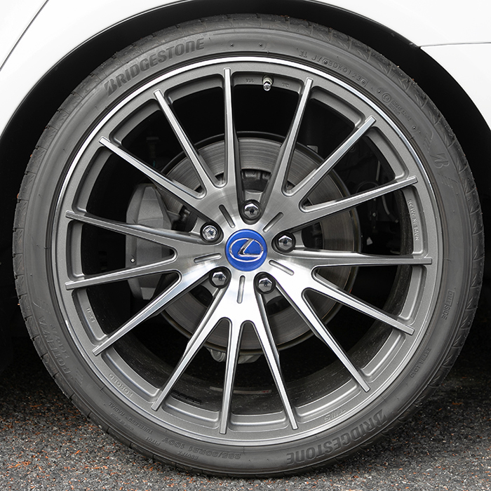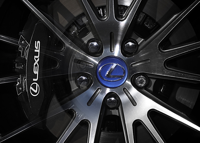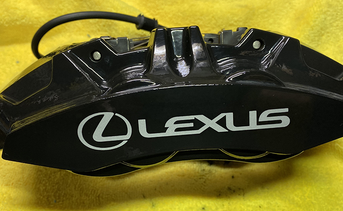 キャリパーは純正仕上げの黒ボディーに、白LEXUSロゴ、ホイールの中でさり気なく主張しています。