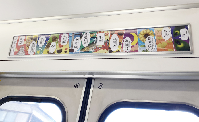 車内の駅名一覧、この雰囲気がいい!!、駅名はフリガナ無しでは読めませんでした(>_<)