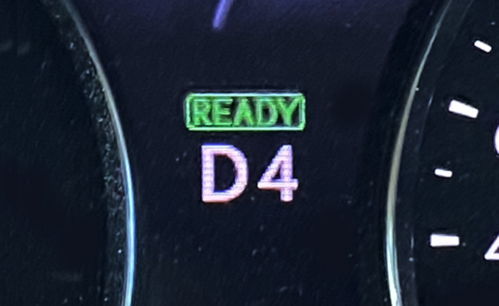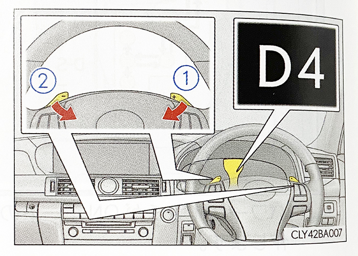 走行中シフトノブをDレンジのまま、パドルシフトのマイナス(左側)を手前に引くと、一時的にマニュアルシフトモードに移行、メーター内の表示は『D4』(←4速に入っている場合)に変わります。そのまま車両速度が停止しスポーどが0になると、Dモードに自動で切り替わります。(シフトレンジD1からS7で選択可能)