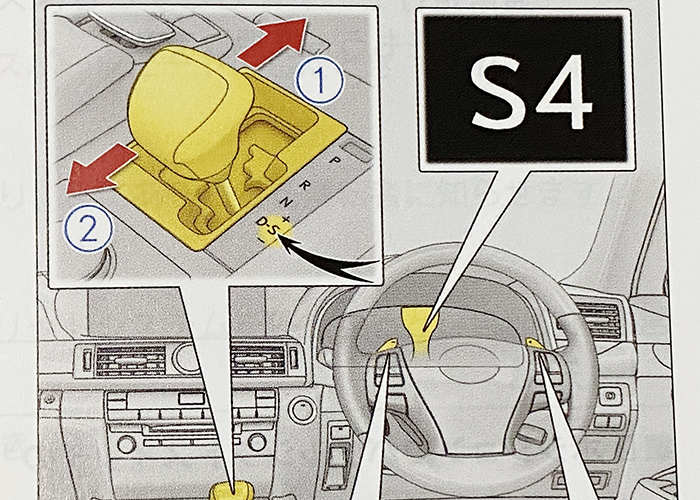 シフトノブをセレクトに動かした場合は、マニュアル制御でシフトアップ&ダウンをする様になり、メーター内に『S4』(←4速に入っている場合)と表示されます。これはシフトノブ側で行うSモード制御と同じなので、動作条件は満たしていると考えられます。(SモードでのシフトレンジS1からS8で選択可能)