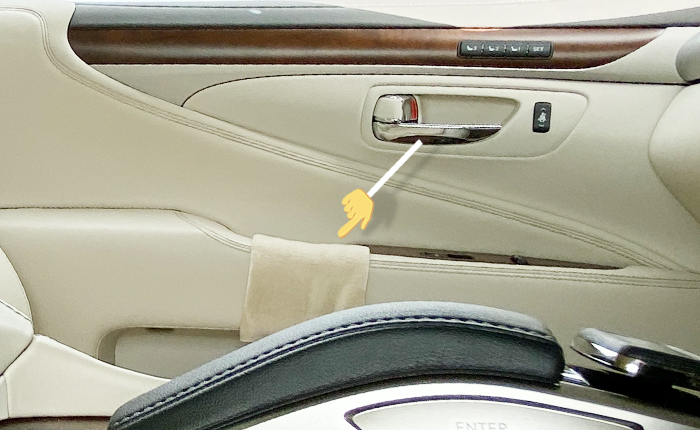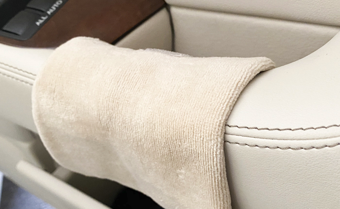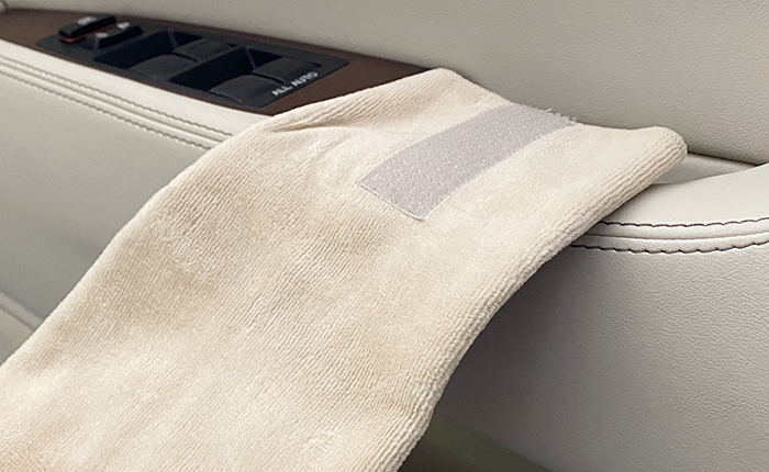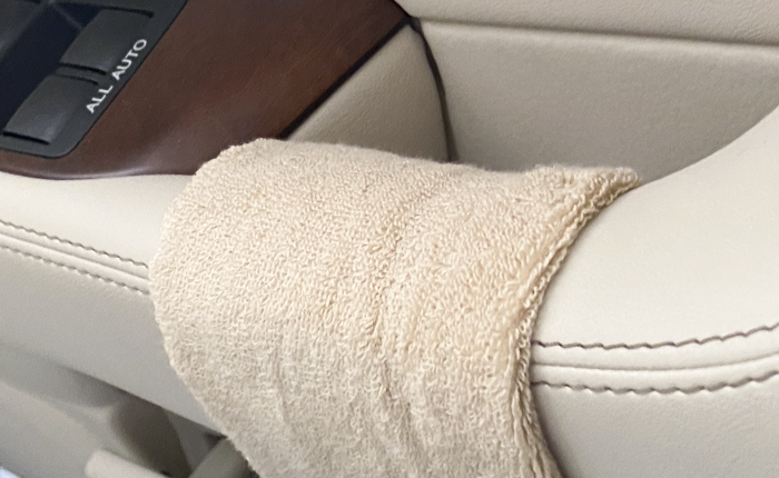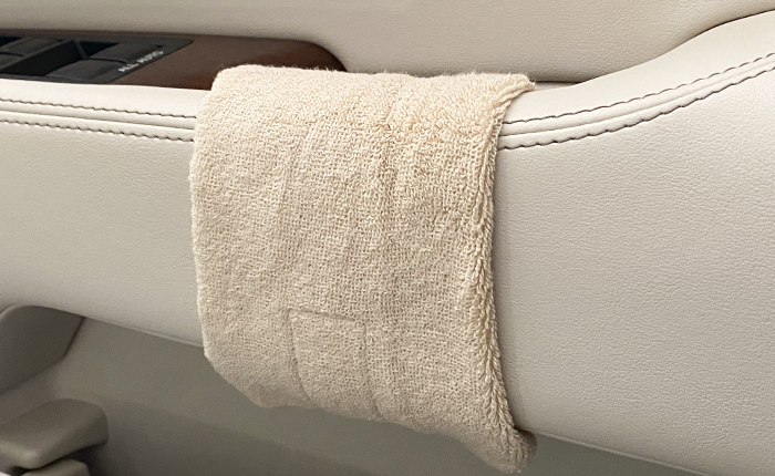 乗り降りする度に必ず触る部分で、一番痛みが進む場所だと思います。そこで痛む部分を保護する目的で何かないかと探していた時に見つけたタオルハンカチリストバンド、マジックテープがついていて巻きつけ調整が出来、アームレストにぴったりのサイズ、素材に今治タオル(←コレ重要)を使用しているので、レクサスノベルティーと同じ♪