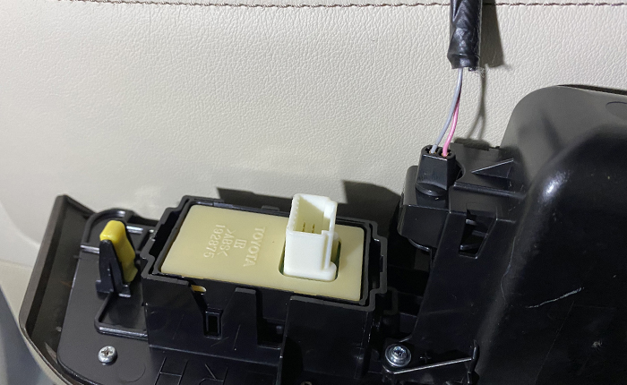 リヤウインドウスイッチと一体で取り外す小物入れベースの裏面を確認。配線と電球ソケット(麦球を装着)がありますが、スモールでは麦球点灯してくれません。