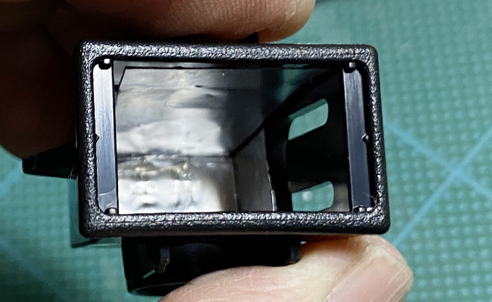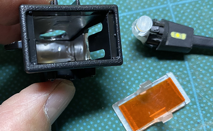平に削り加工、ハウジングの窓部分にアンバーフィルターを貼り付け加工終了。
