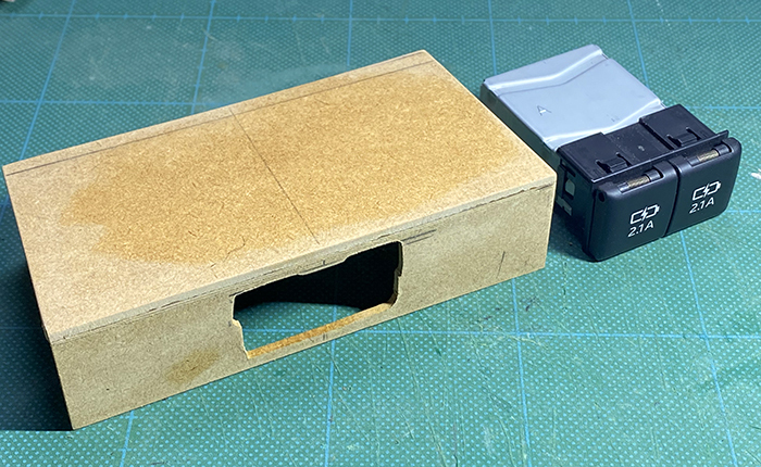 ケース作成にあたり、充電中(L型のUSBソケット)を差し込んで蓋が閉まる大きさにしてあります。