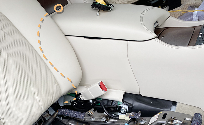 電源ハーネスを作成し、センターコンソール蓋の下部にハーネス用の凹みを作成。