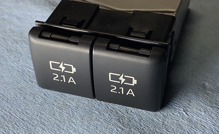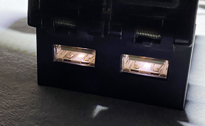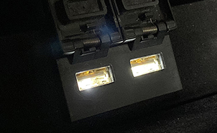 リヤセンターコンソールに設置したUSBチャージャー、充電環境が整ったのはよかったのですが、USB差し込み部分に照明がない為に夜間の使用性があまりよくなかったので、差し込み部分に鉄道模型(1/150:Nゲージ)で使用する極小LEDを埋め込んで夜間の使用性の改善を行いました。