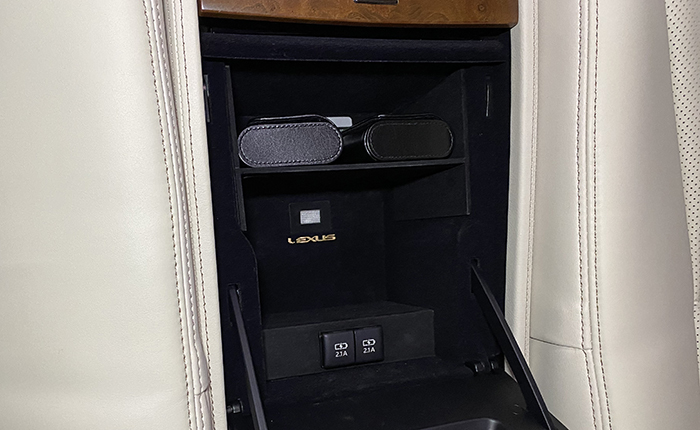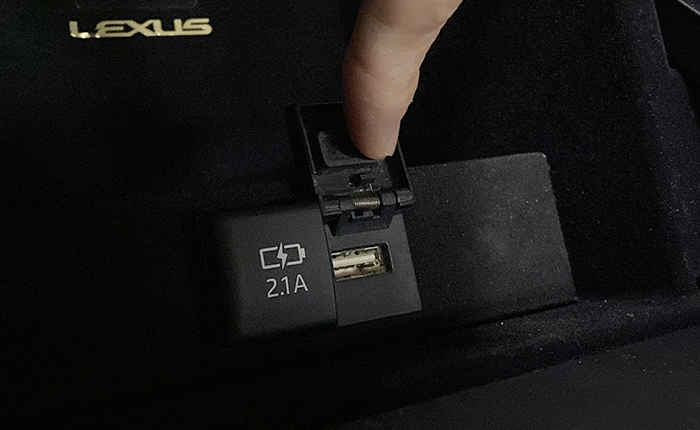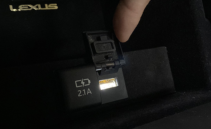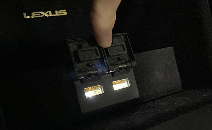 設置前:リヤセンターコンソール、オリジナルの照明(LEXUSロゴの上)を取り付けてはいるものの、USB差し込み部分には光が届かずで、差し込み部分や、差し込む方向がわかり辛い状態・・・。