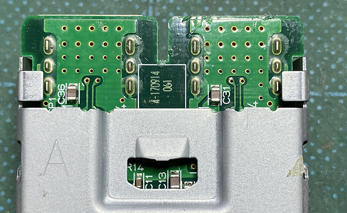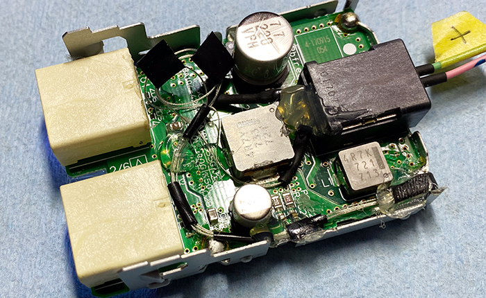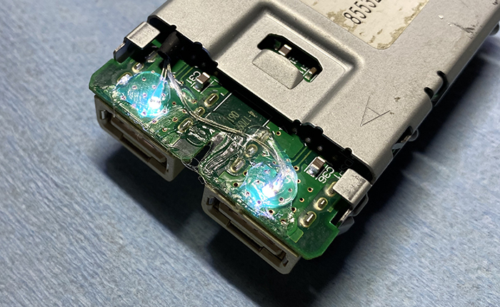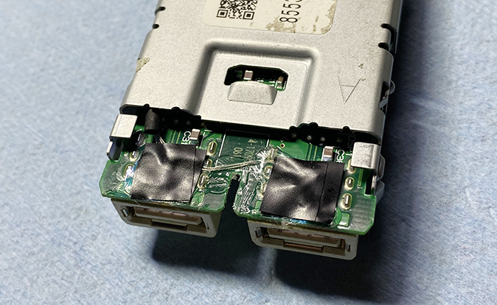 LED埋め込み場所は、USB差し込み口を固定している基盤側に穴を開けて、LEDが小さいのでホットボンドを利用し固定。またリード線部分も基盤の金属部分に干渉しそうな箇所は、ホットボンドで振動防止対策をし、熱収縮チューブを巻き対策を行いました。