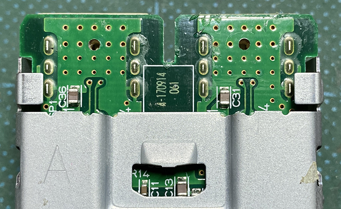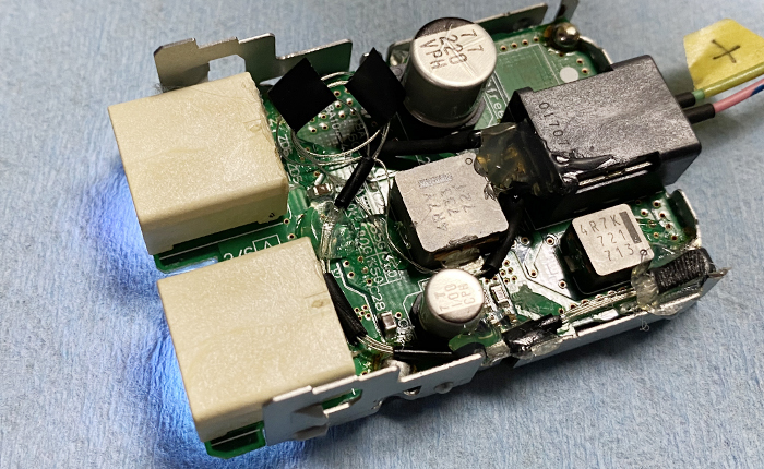 この状態でUSB充電ソケットに差し込みを行い、干渉がないか確認を行、問題ないことを確認しリード線部分の最終仕上げ作業を行っています。