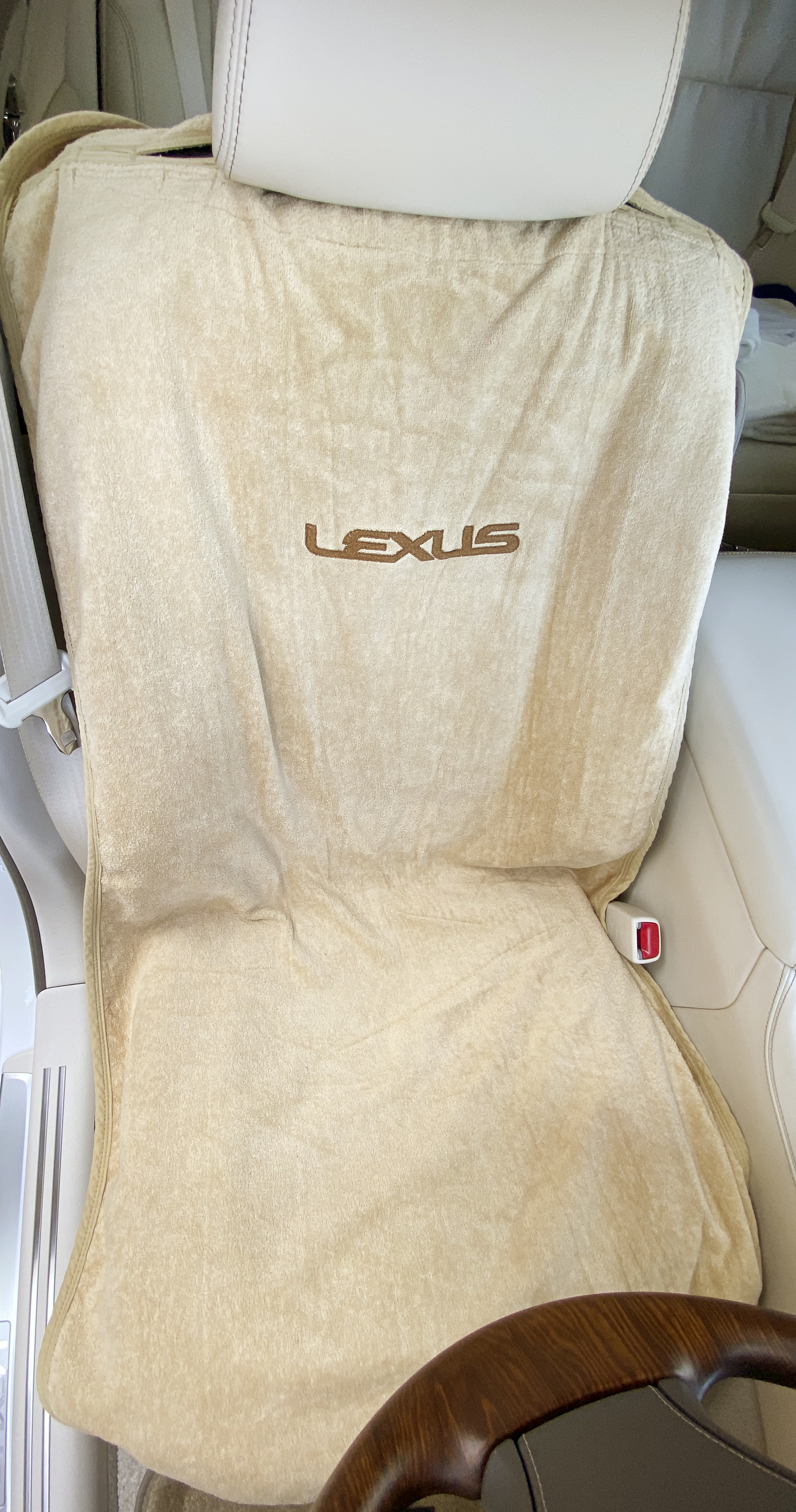 メローホワイト内装は汚れがつくと目立ってしまいます。特に革シートのシワになった部分に沈着した汚れが付着したらクリーニングしてもなかなか綺麗になってくれません。そのような色がもつ維持する上での悩みを少しでも解決するべく装着していてもあまり気にせず入れる物を探していたところ、ネットオークションで見つけた社外LEXUSロゴ入りタオル生地シートカバーになります。背もたれと座面両方をカバーしてくれるので、汚れの付着をかなり防止してくれ見た目も純正でありそうな雰囲気なので、お気に入りのアイテムです♪