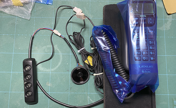 ハンズフリーボタンとスピーカーのケーブルを延長し、電話の動作確認。