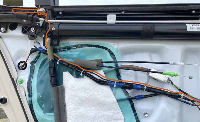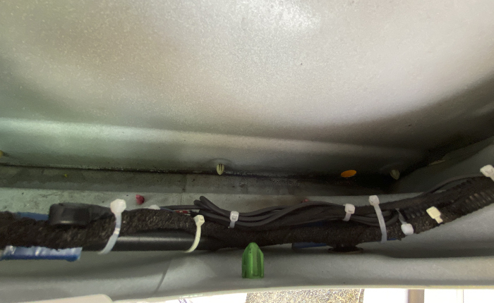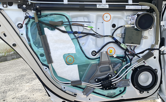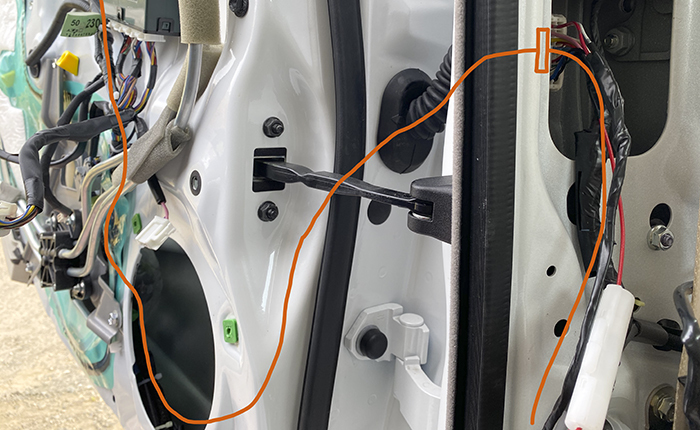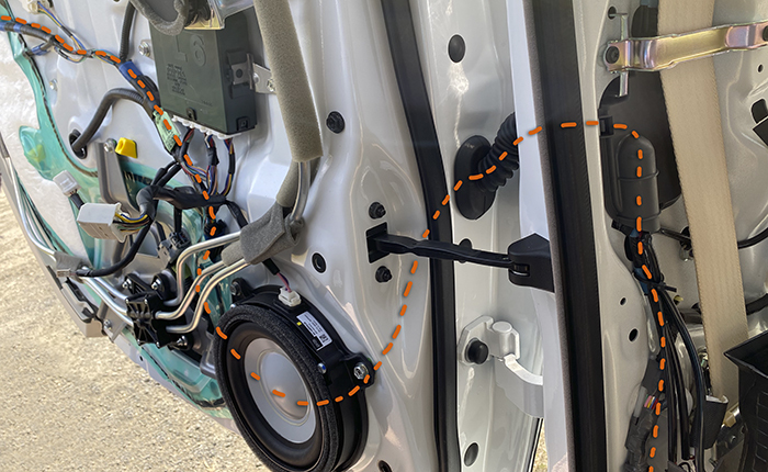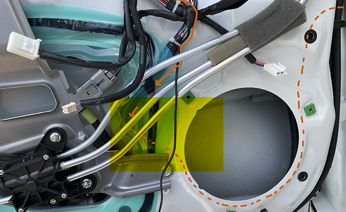 画像の黄色い部分の表面から裏面にハーネスを回し込む作業。この部分は防水の為にブチルテープ処理されていて、純正ハーネスが向きが回り込むように設置され、少しの距離ですがブチルテープが邪魔してこの部分の設置にかなりの時間を要しましたが無事に通過し、スピーカー裏面までハーネス設置完了。