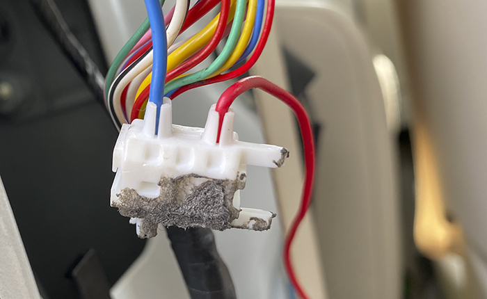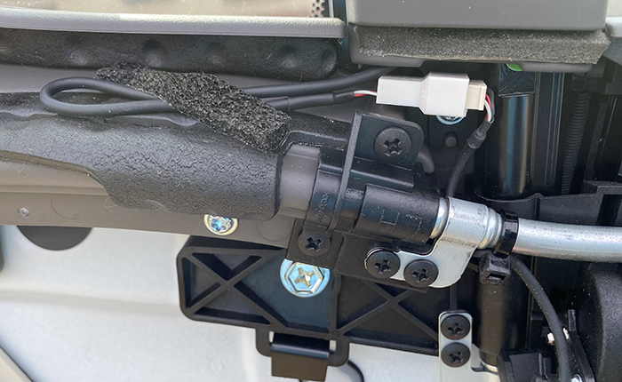 ボタンから出たハーネスは、窓部分のトリムでコネクター接続(メンテナンスを考慮)