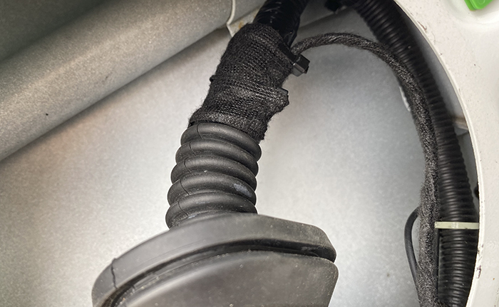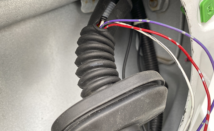 純正のハーネスに添わせて、ゴムブーツへ。