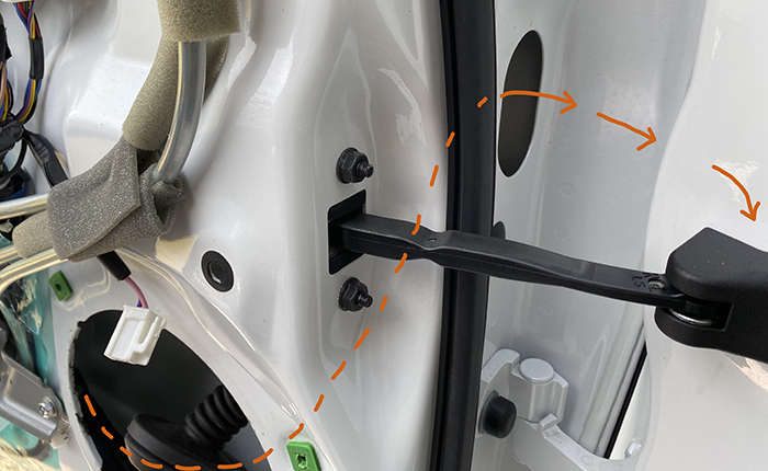 難関部分のドアと車体を接続するゴムブーツ。