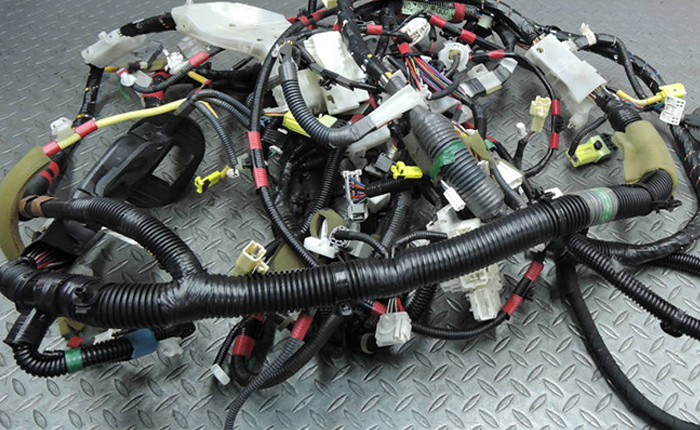 カプラーを取り出したハーネスの山を分別、