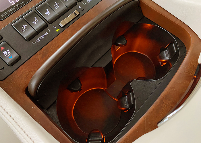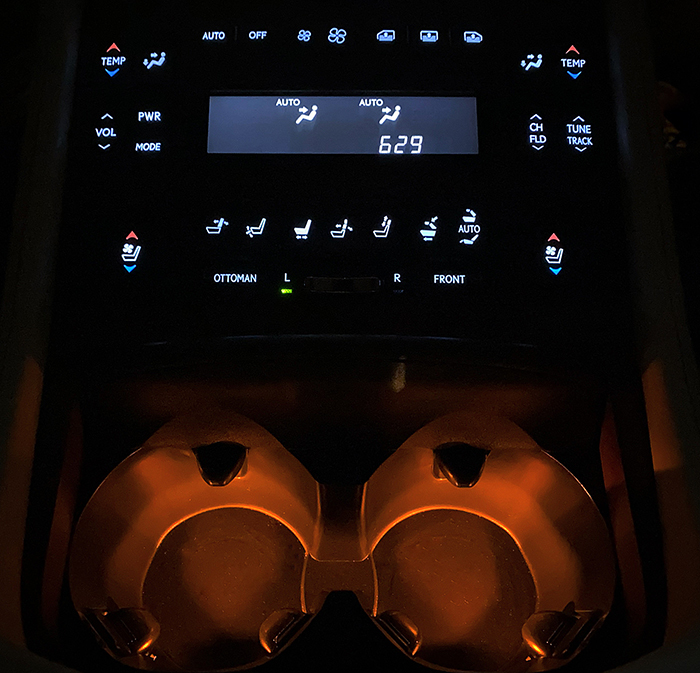 フロントドリンクホルダーに続き、リヤのドリンクホルダーにイルミネーションを取り付けました。フロント同様に間接照明は同じですが、リヤでの使用性と見栄えを考慮し、フロントの左右ドリンクホルダー1箇所からの照明から、各ドリンクホルダー2箇所の間接照明へと変更し装着、照明色は暖色系とし他のイルミネションとの統一をしています。