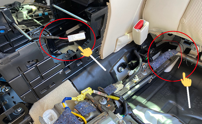 電源は車両のイルミネーションを枝割りし他ものから取り込み、左リヤドアスカッフプレート下までフロントから諸々の電装の追加ハーネスを設置してあるので、そこからイルミネーションをセンターコンソールまで引き込みます。画像赤丸部分のハーネスをリヤドアスカッフプレート下まで延長。