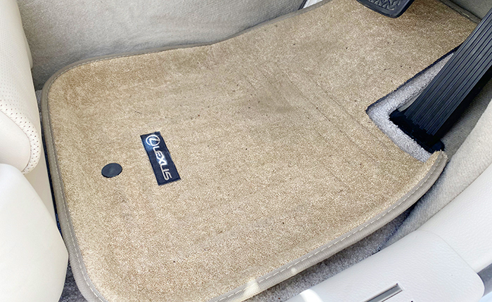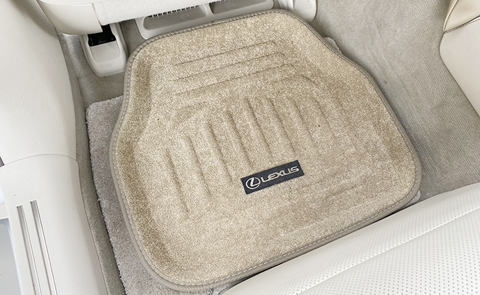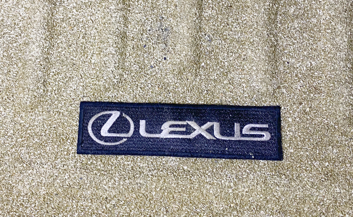 近所のカー用品店で購入、運転席はアクセル部分をハサミでカット、ワンポイントでLEXUSワッペンを両面テープで貼り付けています。