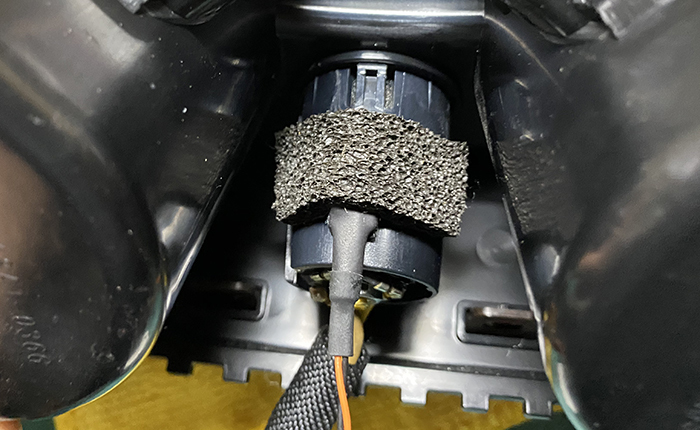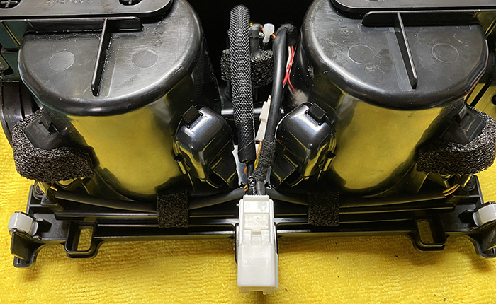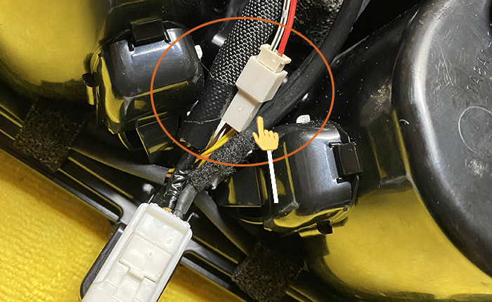 万が一のメンテナンス性を考慮し、純正コネクターのすぐ後ろに中継コネクターを取り付けてあります。