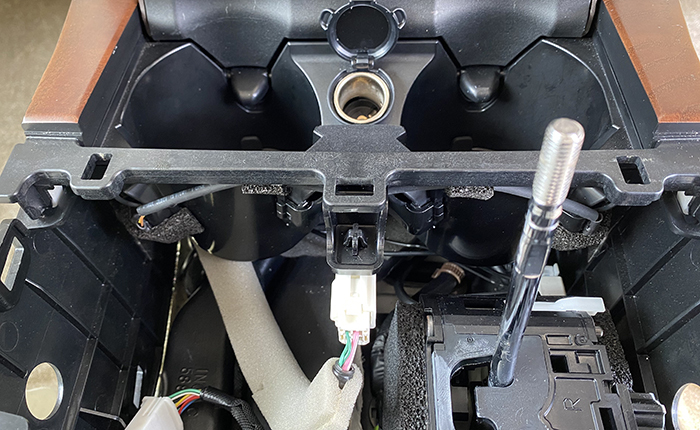 取り付けたLEDのイルミネーション電源は、すでに既設車両コネクターにきているのですいが、ドリンクホルダー側は使用していないためにカプラーが空きになっています。手持ちの端子を追加してイルミネーション線から電源をとりました。
