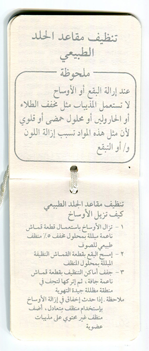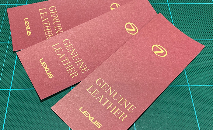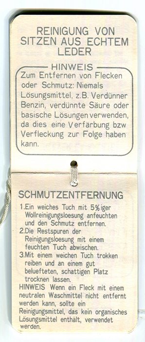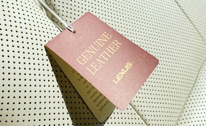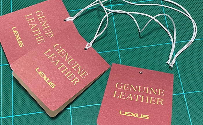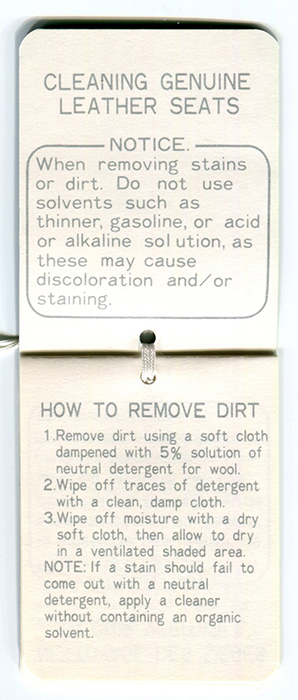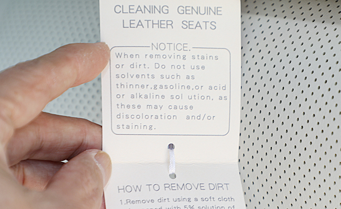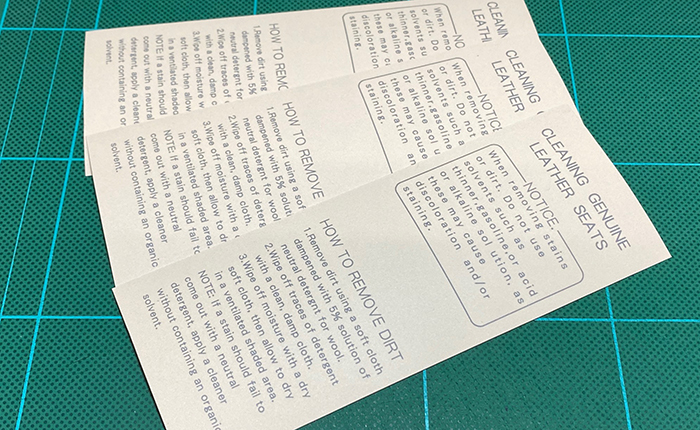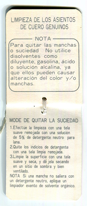 輸出仕様のレザーシートタグ、大きさは日本国内のと同じでが多言語仕様(数ページあります)