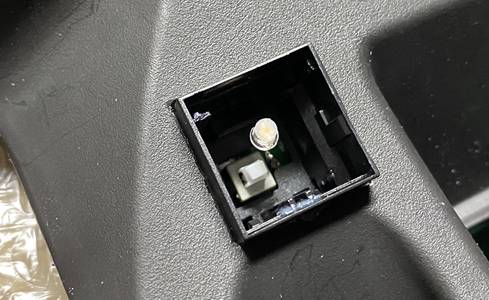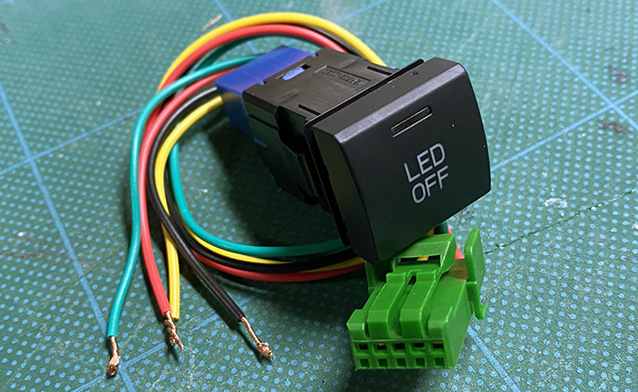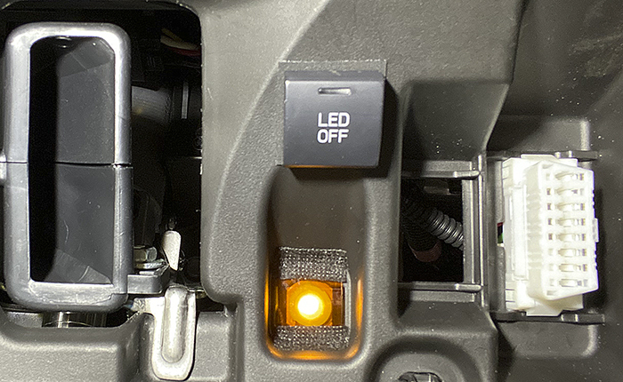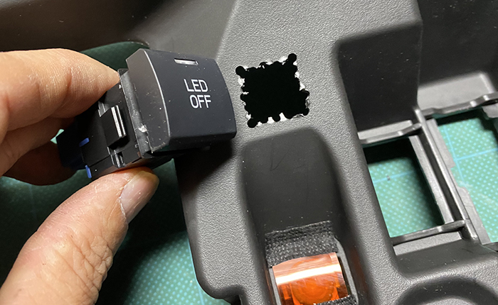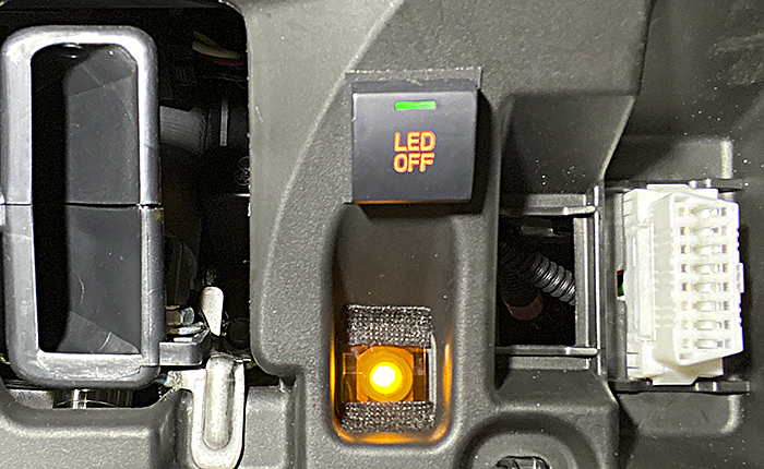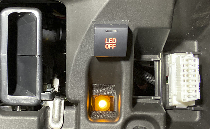 このスイッチは本来はベゼルがあり少し凹んだ状態で、スイッチ表面がツライチになるものですが、あえて飛び出して取り付け、凸型にし運転席から下を覗き込まなくても、スイッチ位置がわかるようにしました。