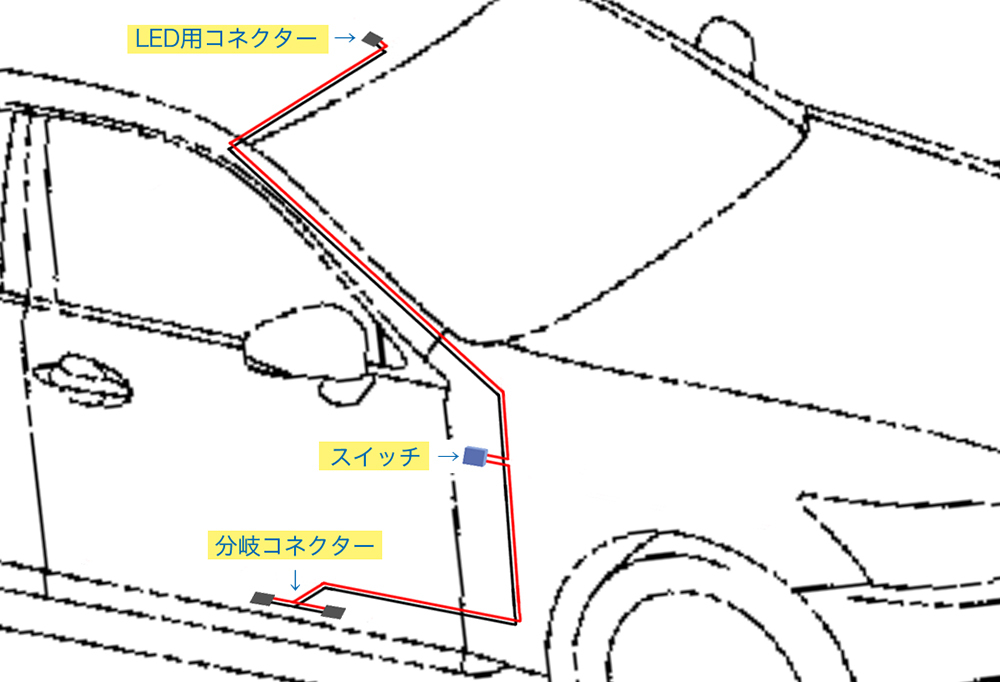 私は、運転席ドア連動で非常時に点灯するイメージで光らせたかったので、運転席ドアのカーテシランプより電源を枝割りし、途中スイッチを設けて任意で点灯コントロール出来るようにしました。