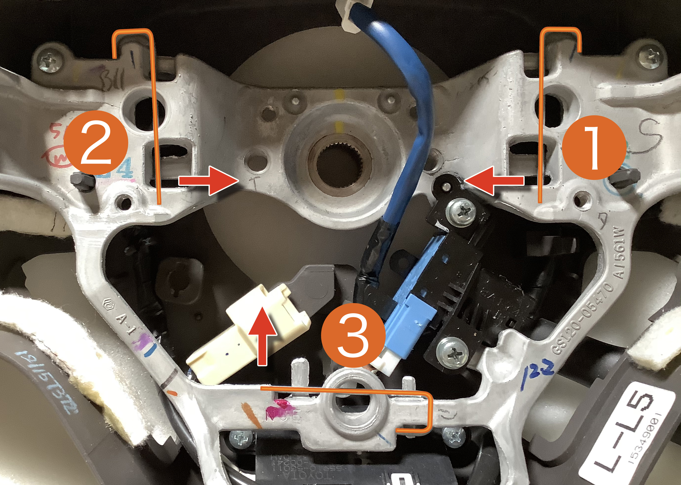 さて、上記したエアバック固定ピンの取り外しですが、まずは運転席側から、のコラムカバーを外して①のピンを押しエアバックが少し手前に浮き出るのを確認してから、下の作業に移ります。