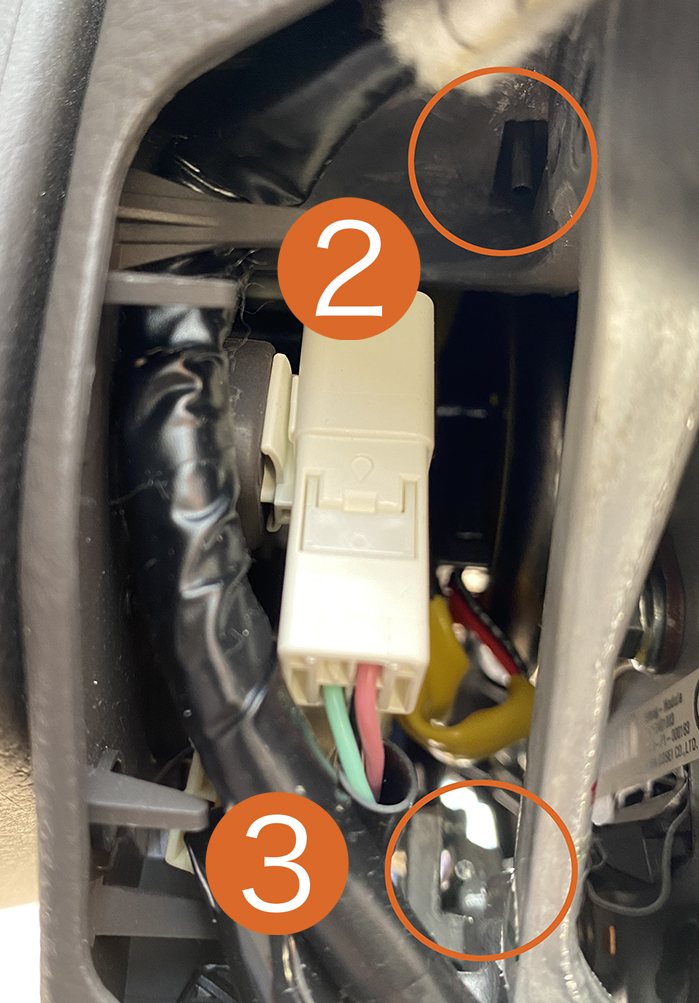 助手席側のコラムカバーを外して、②のピンは押し、③のピンは引き上げます。