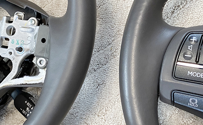革のテカリ比較、左側が入手した新車外しステアリング。